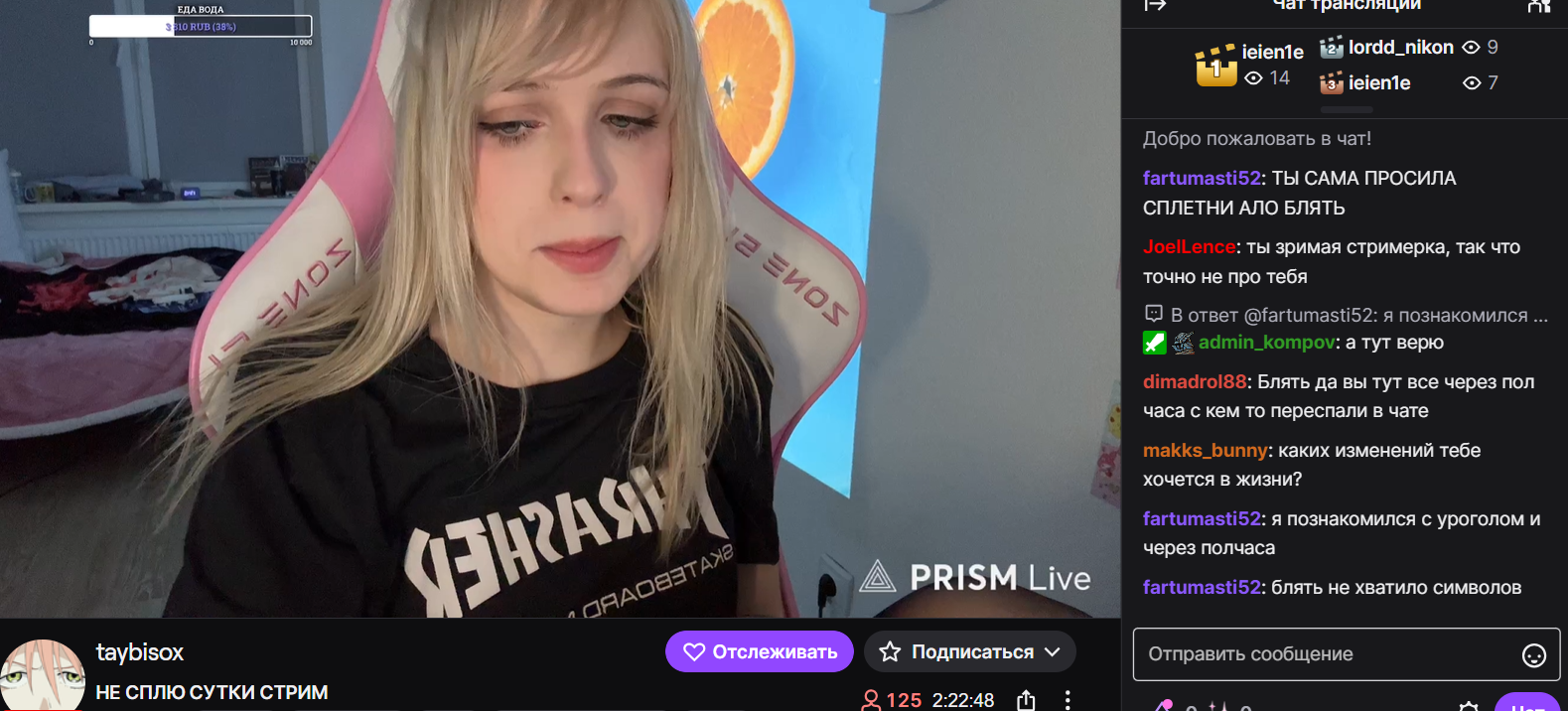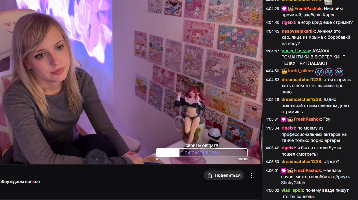 т.е. у неё обратная позиция, вместо: "я вам благодарна, моя жизнь сложилось так потому что вы у меня есть", у неё "у меня такая жизнь потому что я крутая, мир крутится вокруг меня, а вы просто мои фаны бегаете за мной, а вы попробуйте 3 года стримить также подряд, поймёте". то что благодарна только на словах пишется в тгк где-нибудь иногда, но в реальности позиция совсем другая