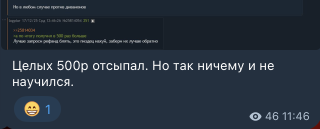 >Да ля, забейте, Двачеры. Если это всё ограничивается лишь той попыткой запугнуть меня, то в целом похуй. Чисто момент с которого можно только покекать - не более