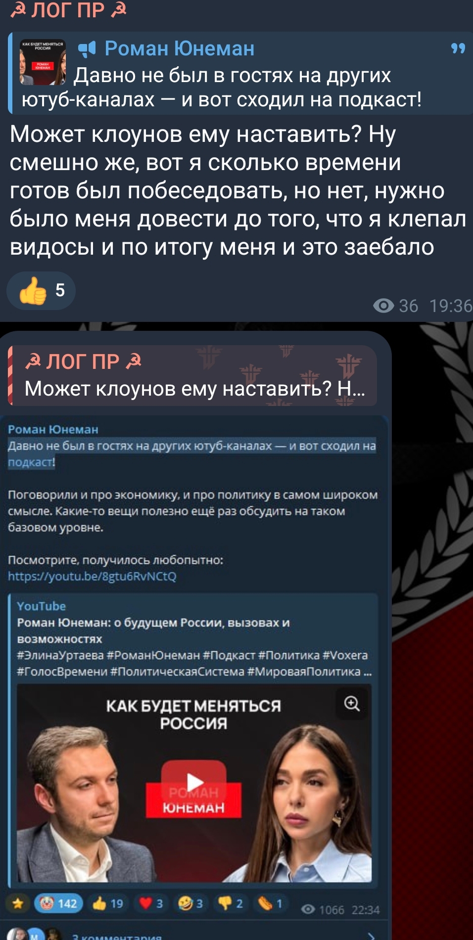 Последние события: Сабж психанул из-за троллинга бунтовщиков ОБ и скрыл все ролики про Юнемана, после сменив картинки в своём тгк и на канале. Называя себя теперь Red Nation