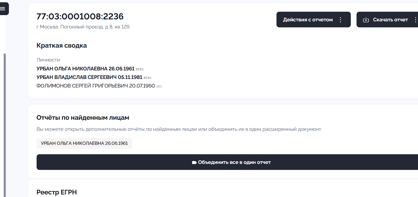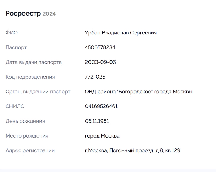Данные из Росреестра за 2024 год. Указанный здесь адрес находится в Богородском районе, где ему был выдан паспорт, что указывает на то, что он как минимум регулярно его посещает, а, сочетая с ранее полученной информацией о нахождении его симки в 170 км от точки в Рязанской области, мы приходим к выводу о его реальном проживании там. Расстояние от Москвы до Рязани 200 км, Рязань находится в самом центре рязанской области, к слову.