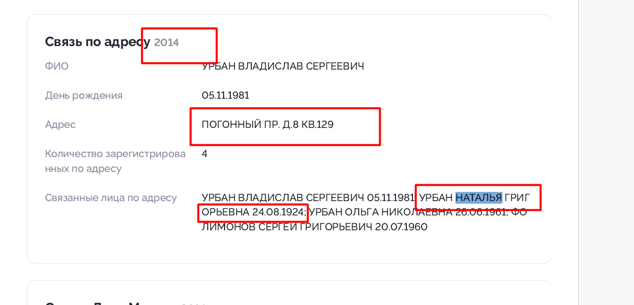Я кстати вчитался в отчёт по пробиву по более старым датам.Судя по всему этот адрес- Погонная 9, является квартирой его бабки Той самой, где он выдал фразу про шорты Данные от 2015-2016 выдали как связанное лицо некую женщину по фамилии Урбан 1924 года рождения