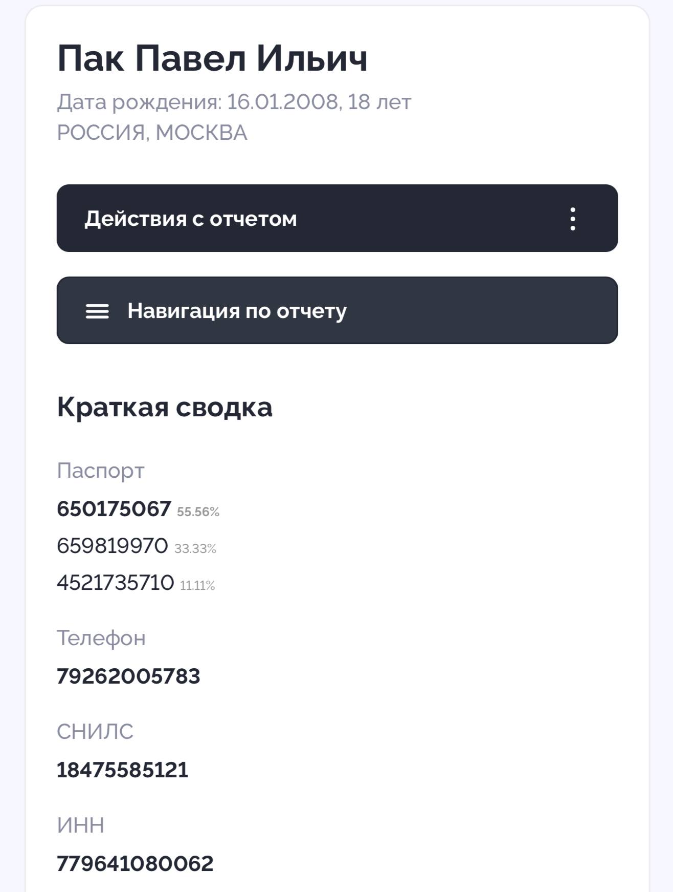>>26109205 Говоря о смерти Владоса- это точно не так, по крайней мере не в Греции. Опять же, по пробиву видно, что он летал из Египта в РФ в 23 году. Плюс да, в пробиве есть и более актуальные данные, например, о получении им той же инвалидности. Так что лично у меня сомнений нет: Владик жив, вопрос только где.