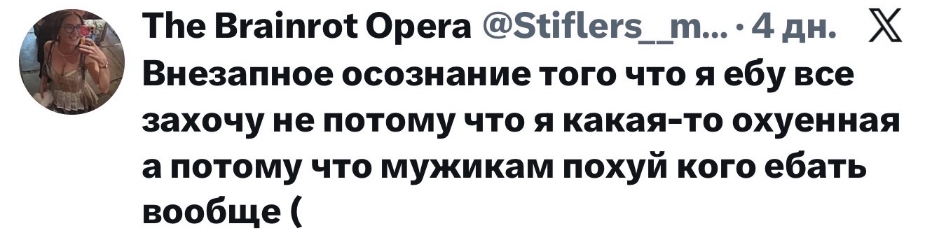 Соответственно, если писик принадлежит адекватной тянке, то она тоже, будет вести себя как некоторая гейша, хорошая жена, понимая суть социального контракта. А если писик принадлежит духовно богатой среднетян, то она не вывозит простое выполнение контракта. Ей тупо нечего предложить: она и некрасивая, и туповатая. И такая тян обретает другой "внутренний мир", где она фантазирует о том, какая же она ахуенная не то что эти традвайфы. Но отличие в том, что она не сразу окажется с голой жопой на морозе, потому что мужчины наивны, и какое-то время будут верить в её фантазии. И она, воодушевленная, будет сидеть в интернетах и писать о том, что диско лучше куры.