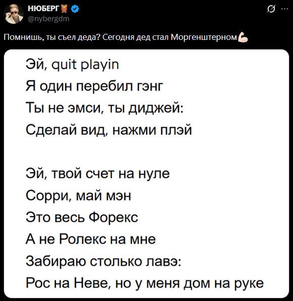 у меня была надежда на семиминутный трек, что там будут какието ИНСАЙДЫ и ВСКРЫТИЯ ПОКРОВОВ — но это тупо семь минут монотонного бубнежа ниочём под один и тот же всратый бит. кем надо быть чтоб такое выпускать???