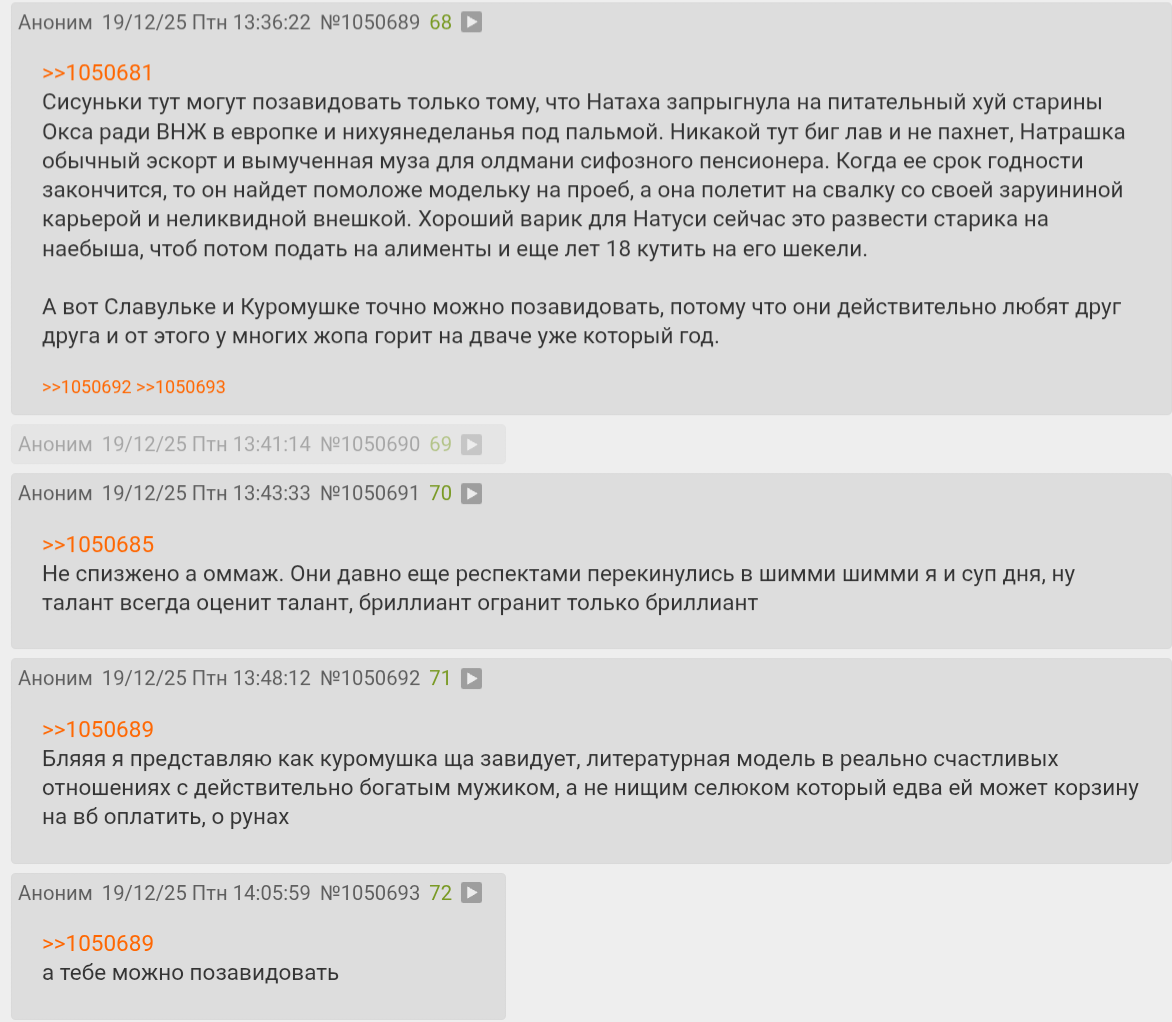 >>25801261 >>25804081 >>25804249 >А Курома на кого похожа? База сисуньства, когда Жопич был с Диско ее только и срали, теперь, когда она сама выставляет, что торчала, как и подозревали, так она в сто раз лучше Куромы. И это тогда, когда она объективно очень постарела, все так же торчит, все так же жалуется на бедность и непризнанность. После того, как устроила тряску за три рубля.>>25802350 По совпадению еще с тех самых пор никто не вступал с ней в долгие отношения, наверное потому, что характер отличный. А может потому, что закомплексованные нетакуси это пиздец тот ещё. Такое лицемерие, внешне они обе норм, но принести фотки десятилетней давности, на которых среднетян схуднувшая на влажных питерских спидах и сравнивать её 23 лвл и 29 лвл Курому. Охуенная тема. Причем вайб у них винишкотян художниц у обеих, значит нравятся Жопичу такие, нравится вместе хуйней страдать.