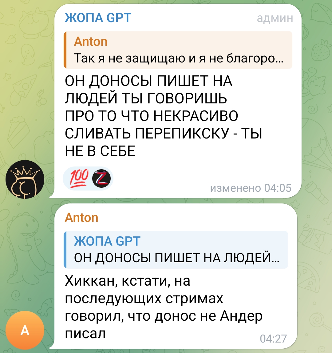 Чел, сливать личные переписки один из участников не зашквар а пруфы, зачем ты пытаешься этому придать свой искажённый шизофренией смысл? Сливать личные переписки зашквар только третьим лицам, так что не трясись, лучше иди подсосни крысе Андеру. Этому Унтеру при встрече в ебло харкать за травлю людей.