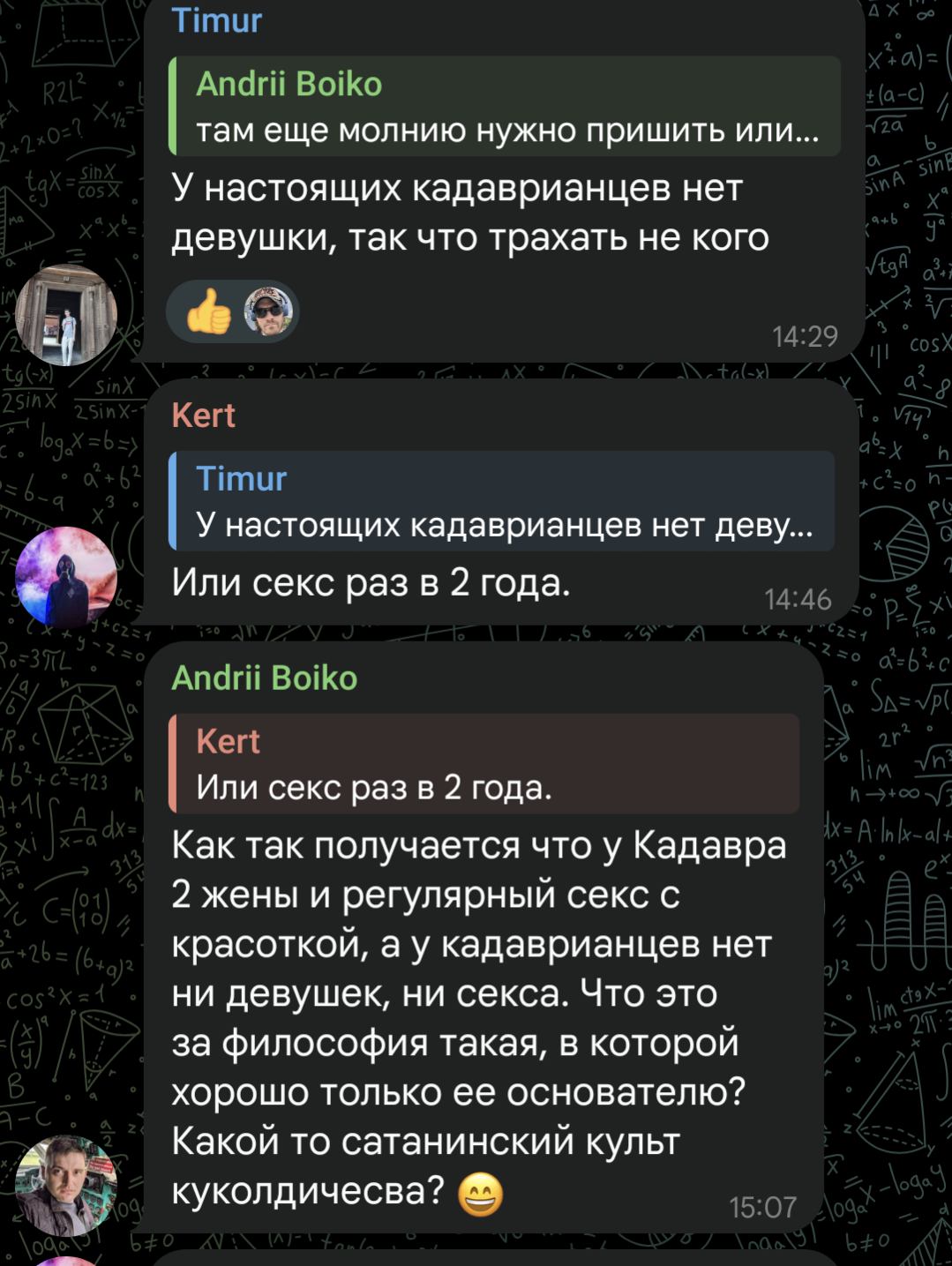 Что имеет в сухом остатке? Кадаврианцы - абсолютное нормальные, социально развитые люди, у них есть работа хороший заработок позволяющий делать донаты, есть жены/мужья, дети. А в этом треде кто сидит? У кого может быть потребность изрыгать себя ненависть и пытаться как-то нагадить людям, которые ничего плохого им не сделали. Я уверен за анонимностью, там такие персонажи прячутся что просто пиздец, и дело даже не только во внешности. Вы ведь натульно псих-больные сектанты, у вас кроме этого треда вообще в жизни хоть что-то есть? А если есть то почему вы здесь просиживаете и тратьте кучу времени на ненависть и подлянки к ноунейм стримеру? Закройте этот тред пока ещё не поздно, а тут одному уже мерещится что его посты сам Друже тут трет, вы ведь такими же станете со временем. Я вам как взрослый человек добра желаю, так что послушайте меня и перестаньте заниматься этой ерундой.