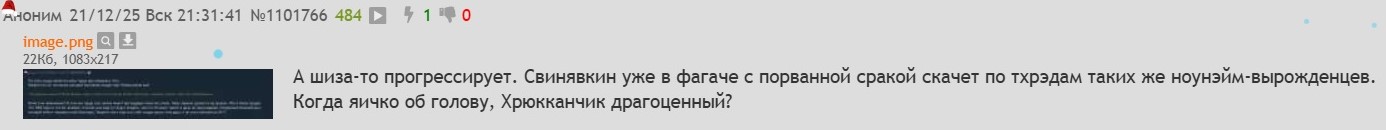 лол, какой-то шиз мочеглот, задонатил кнуру свой бессвязный поток сознания, в попытке что брат по разуму его поймет, в котором конечно же не обошлось без мыслей о поедании говна