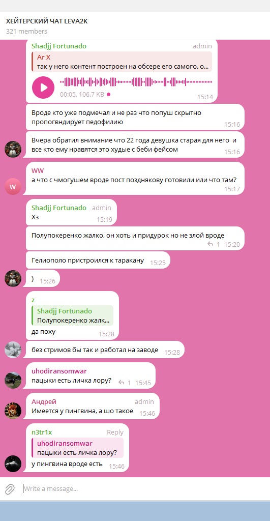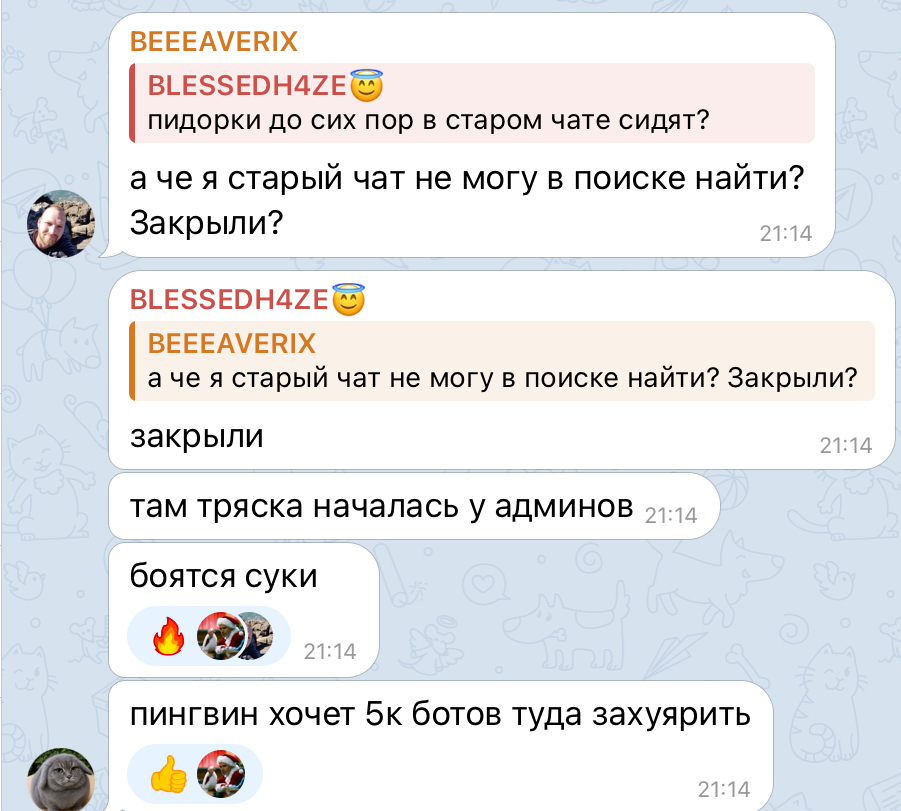 хейтерский чат пал хохлы на админе побанили всех кто чмогуша хотел качнуть за поддержку украины и пингвина забанили который виллу штурмовал плюсом чмогуш начал разбанивать всех