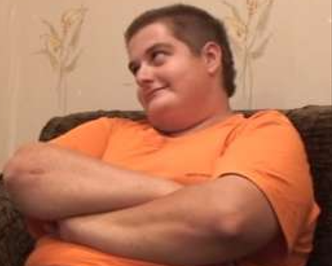 Но не замечает перед собой обоссанный диванчик, который он тоже когда-то спер с помойки, и плюхается на него с разгона. Да так что футболка размером с огромный мешок которую он носит, приподнимается, оголяя крупных габаритов округлости.