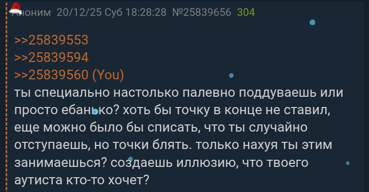 >>25839553 >>25839594 >>25839560 ты специально настолько палевно поддуваешь или просто ебанько? хоть бы точку в конце не ставил, еще можно было бы списать, что ты случайно отступаешь, но точки блять. только нахуя ты этим занимаешься? создаешь иллюзию, что твоего аутиста кто-то хочет?
