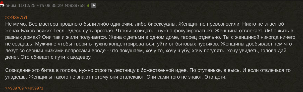 Порой я думаю, что Бог есть. Потому что местное быдло целиком и полностью заслуживает свою жизнь с позволения сказать жизнь. Это одиночество, шизофрения, инцельство, вот на 100 процентов каждая ноющая хуета это заслуживает, хвала Аллаху что это дерьмо заперто здесь и никогда и ничего не сможет изменить в своей жизни. Мразь должна страдать и умирать в агонии так и будэ. Аллаху Акбар.