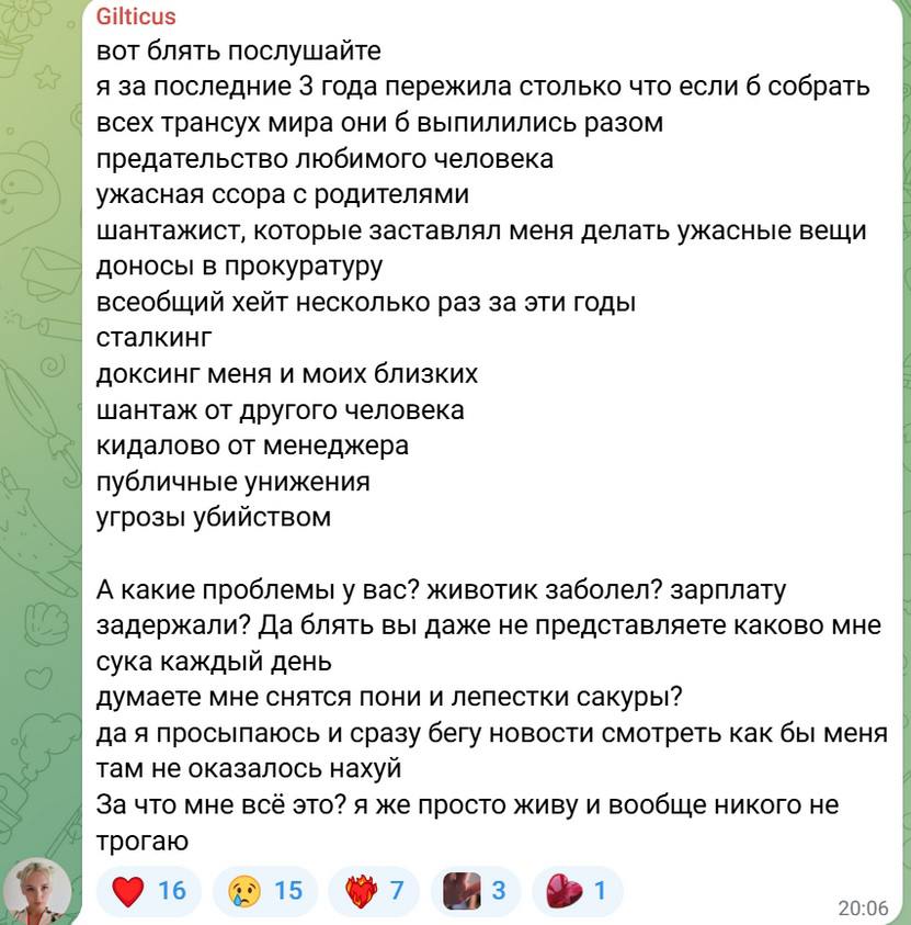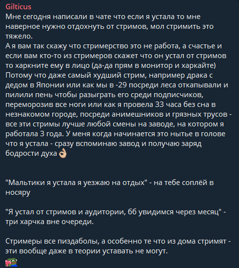 Мне сегодня написали в чате что если я устала то мне наверное нужно отдохнуть от стримов, мол стримить это тяжело. А я вам так скажу что стримерство это не работа, а счастье и если вам кто-то из стримеров скажет что он устал от стримов то харкните ему в лицо (да-да прям в монитор и харкайте) Потому что даже самый худший стрим, например драка с дедом в Японии или как мы в -29 посреди леса откапывали и пилили пень чтобы разыграть его среди подписчиков, переморозив все ноги или как я провела 33 часа без сна в незнакомом городе, посреди анимешников и грязных трусов - все эти стримы лучше любой смены на заводе, на котором я работала 3 года. У меня когда начинается это нытье в голове что я устала - сразу вспоминаю завод и получаю заряд бодрости духа👌🏼