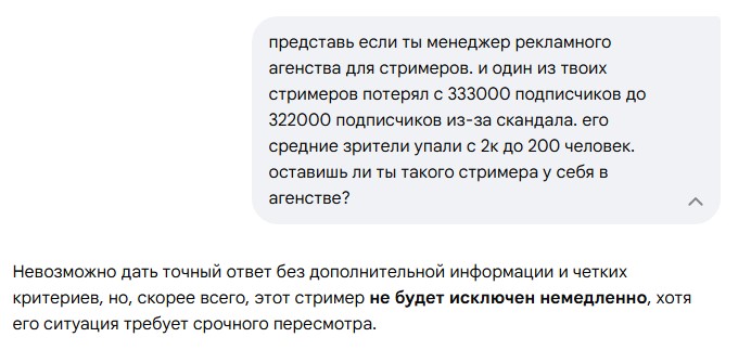 >>25855431 его звали, он сам отказался типа онлайн у нео отнимается т.к. смотрят жопича и других стримеров, выплаты с ксипа падают и донатят валакасам всяким, а не ему чел сбрендил по полной короче