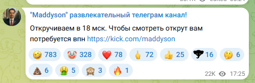 Блин, хотел заскринить и зарофлить с нищего онлайна мэда после того как кик отправил в теневой бан для россиян стримы по казино, а у него там 7.7к зрилов( Я блин думал будет максимум косарь, приколы уже заготовил про накрутку и всевозможные перекрытия против чмодьедаунов, которые стали бы со мной спорить и оправдывать чмодье(