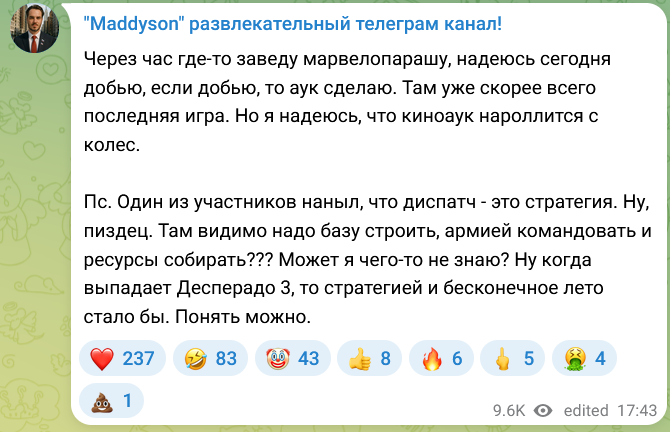 Пс. Один из участников наныл, что диспатч - это стратегия. Ну, пиздец. Там видимо надо базу строить, армией командовать и ресурсы собирать??? Может я чего-то не знаю? Ну когда выпадает Десперадо 3, то стратегией и бесконечное лето стало бы.