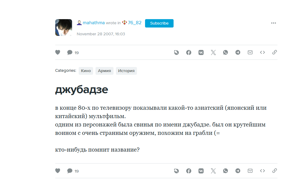 Зачем эту дичь показывали постсоветским детям - загадка (также там видимо был какой-то маоистский антирелегиозный подтекст, который никто не понял). Но поскольку школонарод тогда ещё не был избалован всякими там пиксарами, диснеями и качественным аниме, китайская ебанина тоже очень неплохо заходила. Особенно постсоветские дети полюбили воинственного антропоморфного свина Чжу Бацзе ("Свинья Бацзе"), которого в результате misheard-а все называли на окологрузинский манер Джубадзе. Он когда-то был человеком, но на пиру набубенился винища и приставал к феям, за это его одарили свиной головой. Помню наш класс как-то выгнали на какой-то субботник с облагораживанием территории школки, но это была ошибка, потому что завидев грабли, одноклы схватили их и с криками "Я ДЖУБАДЗЕ!" начали великую битву между собой.