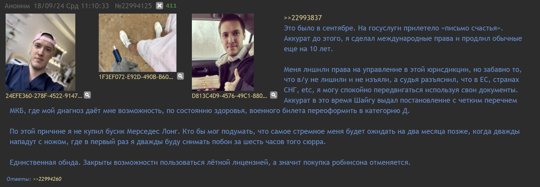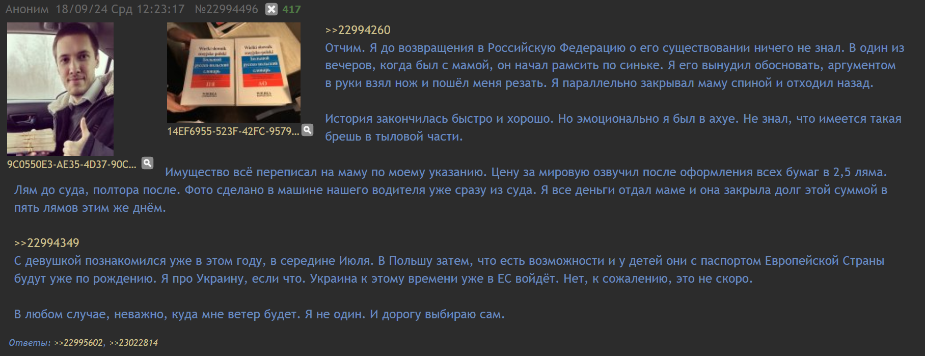 >>26154484 Тимур перебесился и вернулся в родную ДС-гавань, где у него родственники с крутыми связями. Последнее, что он писал, это морозная история, как он хладнокровно содрал с бывшего отчима 2,5 ляма отступных налом, за то, что тот слегка порезал пасынка по пьяни. Еще хвастался, что строит свой Дом-2 в Подмосковье и строит любовь с женщиной-врачом, дагестанкой по национальности, вероятно знойной и дикой красоты, как богиня Kira Queen, от которой у всего Дагестана полыхает как сопла супер-ракеты Илона Маска.
