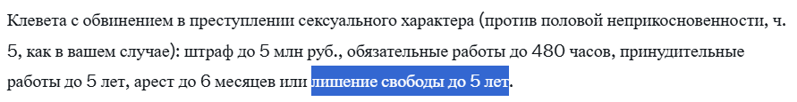 Сасавот пишет заяву за публичную клевету про педофилию, это 5 лет Анар пишет заяву за публичную клевету про фейковое имя, это 2 года Юзя и Братишкин пишут заяву за травлю, это еще по 2 года за каждого Итого Чмодье отъезжает на 9 лет, буки подсуетятся и еще русофобких и экстремистских высказываний накинут, это еще +20 лет и статус инагента