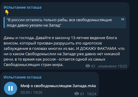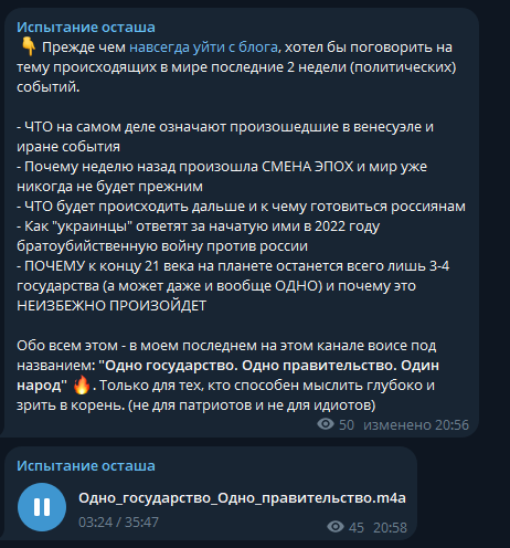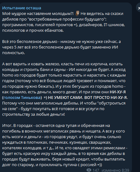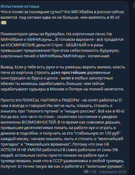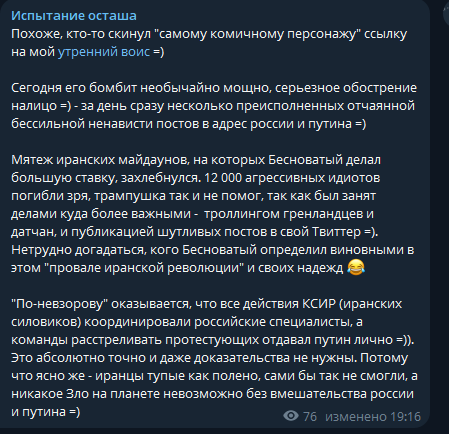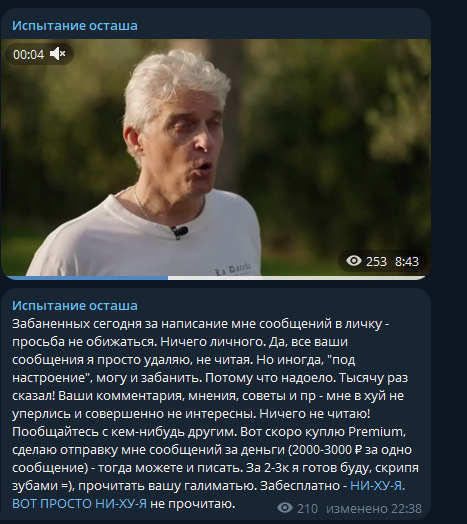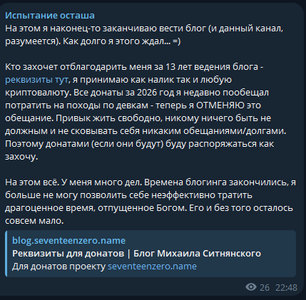 Ситнянский -- [очередной] пример того, почему не следует донатить крупные суммы. Мало того, что не ценит (легко пришло), но начинает требовать больше, не обращая вниания на "мелочь". При этом контент деградировал: большие выверенные текстовые статьи --> сообщения в Телеграме под настроение --> Никому ненужная бессмысленная флюгерная шизотерика.