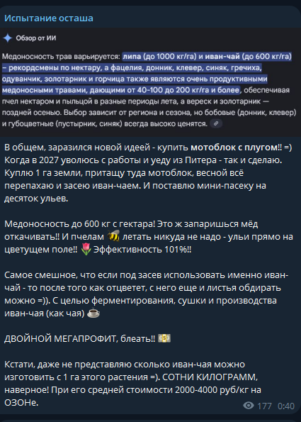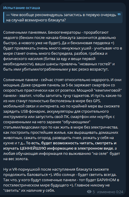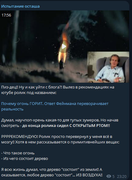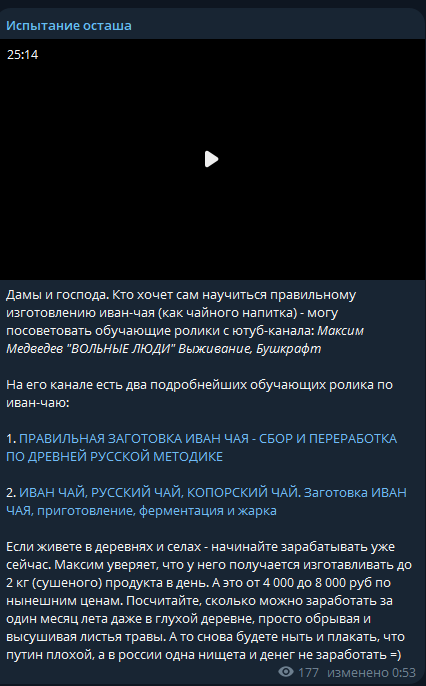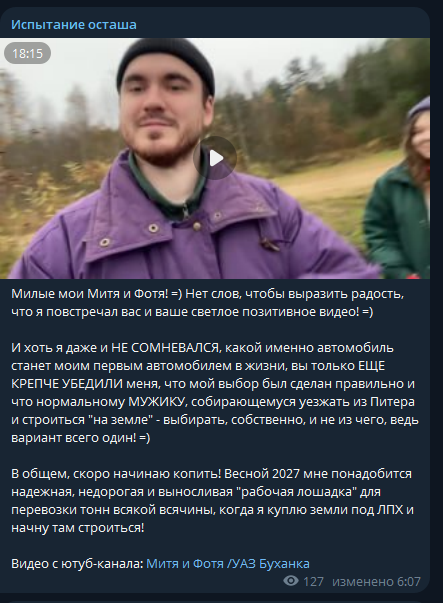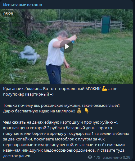 >>26039962 Текстовый блог — пустая трата времени. Михаил планирует уходить в видео формат. Заведет ютуб блог, где будет поучать городских овощей как должен жить настоящий мужик. Нас ждет лайв контент про пчел, строительство дома, сельское хозяйство, выживание в лесу и ещё много чего интересно и познавательного. Ждем всем тредом нетерпением!