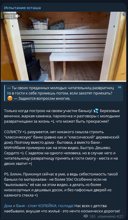У сиси там хозяйство мечты 2.0 на подходе, в прошлый раз он смаковал подробности вокруг сортира, в этот раз объектом грез стала бытовка. Дегенерат собирается делать кирпичную печку в ней, и раствор для кирпичей будет бесплатный - ведь песок можно найти повсюду, а вместо бетона подойдёт глина, вот так вот лысый собирается переигрывать мегаполисных овощных строителей.