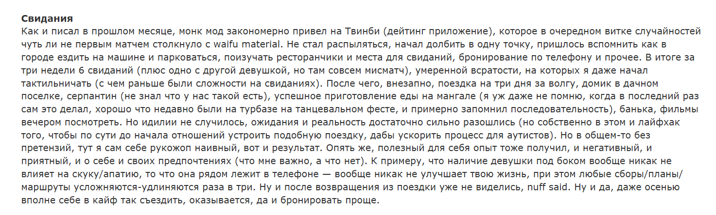 "Свидания Тут тоже прогресс, минипутешествие, домик, банька, несколько приятных моментов. Но, увы, не вывез, дроп, после чего — откат и по привычкам, и по желанию что-то делать в этом направлении. Но и от некоторых наивных убеждений избавился, некоторые вещи попробовал, пригодятся"