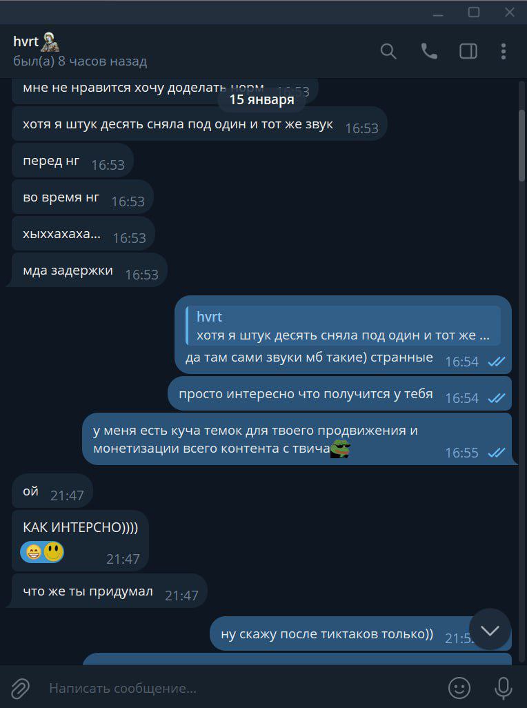 > отчаянно хочешь вернуться Думаю ему похуй, если бы хотел вернутся, то начал с простого привет на стриме или с ТГ-чата. Его не банили если что, не прогоняли, а сама Валя отрицает, что у них есть конфликт. Вижу его иногда у Лали и Элисроут, Валю не упоминает.