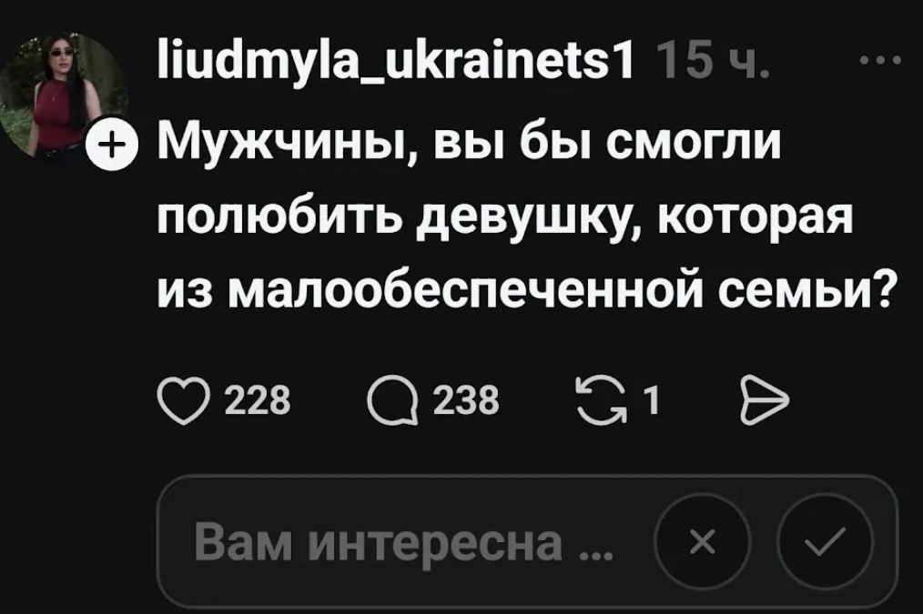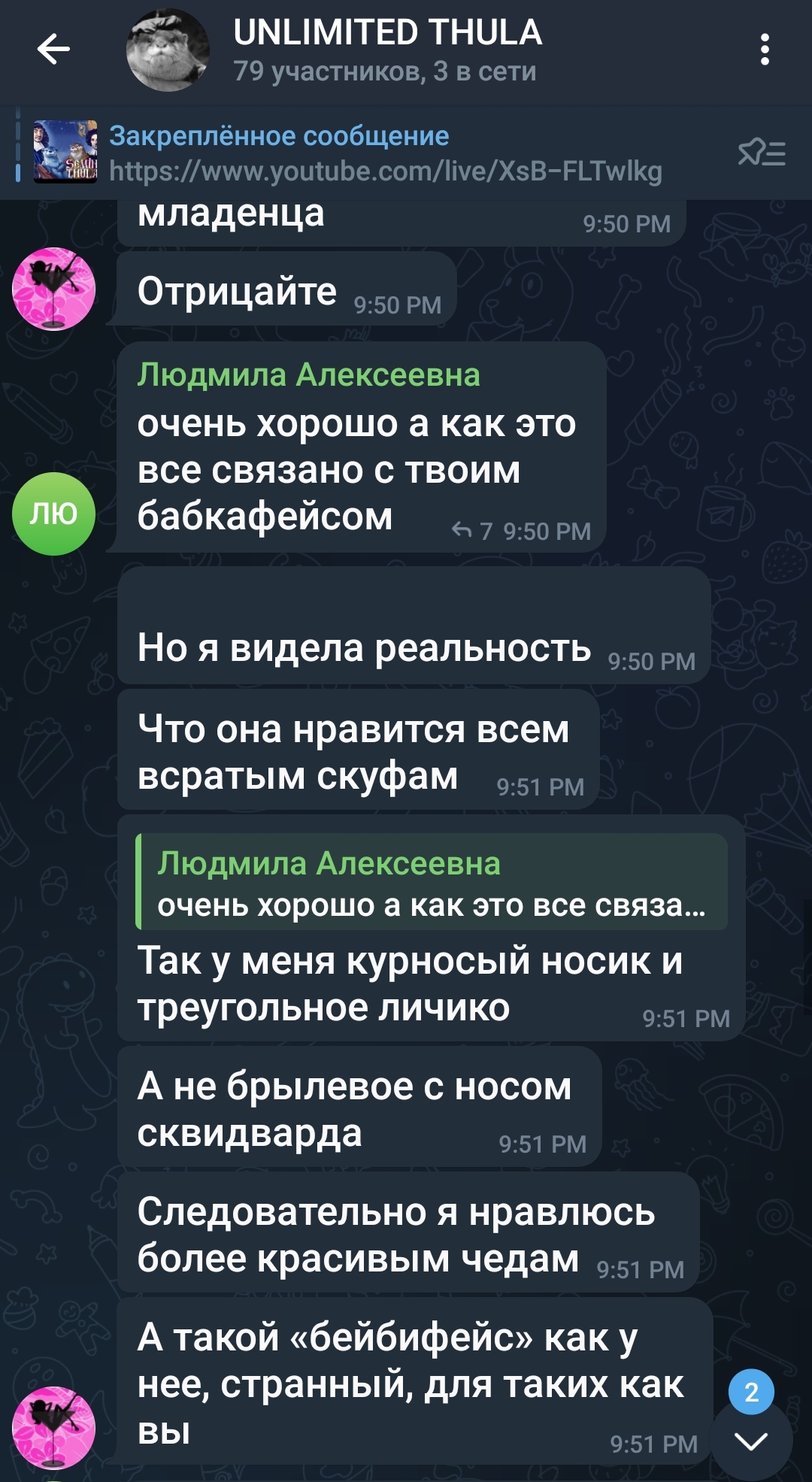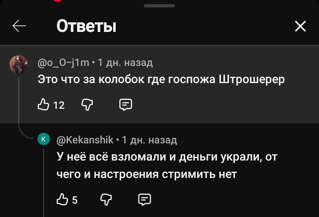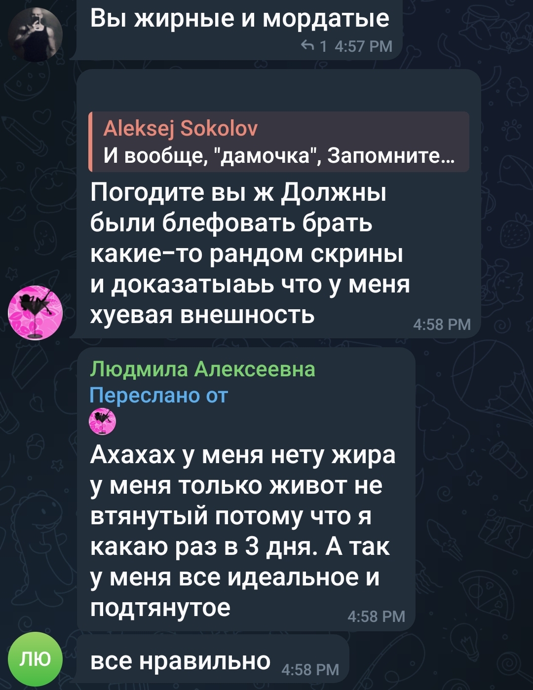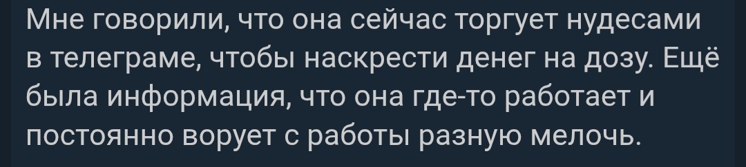 вообще шутки в сторону, я по ее текстовым сообщениям реально подумал что это какая-то мерзкая хуйня, а теперь вижу что просто травмированная девка, безотцовщина походу + еще хз что, не хочу даже предполагать. надеюсь, Даша не сильно ее обосрет (надежда на это не больше мандавошек на ее же пизде