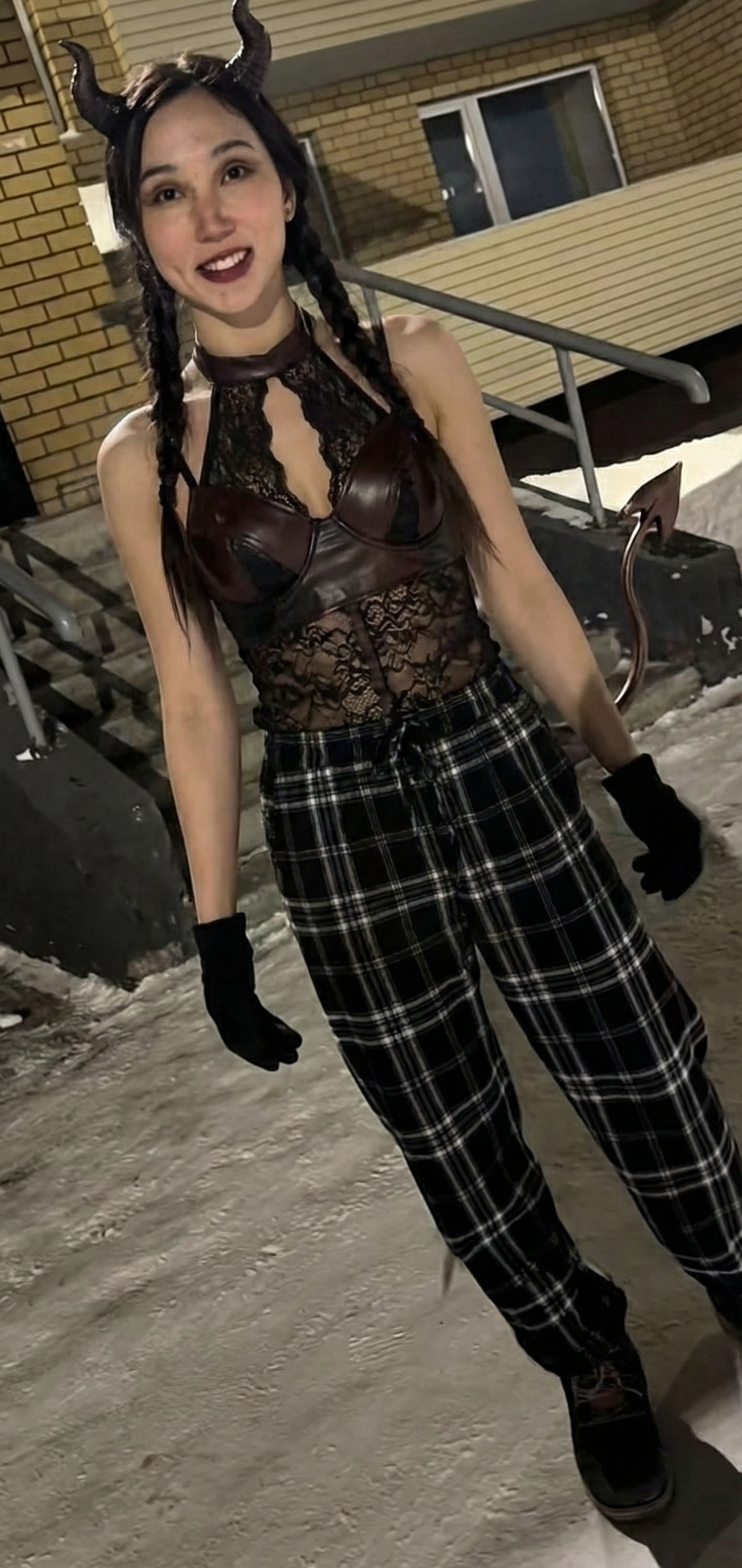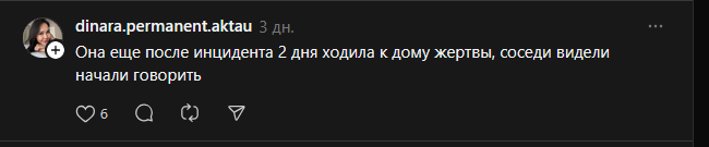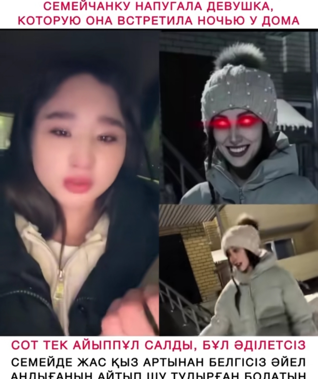 Стори: Конфликт начался с того, что Анель попыталась зайти в подъезд за Аружан, но та услышав, что прямо за ее спиной кто-то очень очень быстро топает, оглянулась назад, и увидела нашу Анель, передвигающуюся с военной выправкой, и решила пропустить Анель вперед. Но Анель взбугуртнула и начала настаивать на том, чтобы Аружан вошла первой, попутно распуская руки. Бугурт по всей видимости был вызван тем, что она торчала там хуй знает сколько, и все ради того, чтобы ее пропустили вперед. Аружан решила не идти в подъезд, а начать снимать на телефон. На видео попали первые секунды её бугурта, а когда Анеля заметила, что ее снимают, она сразу же перевоплотилась в милую, кокетничающую девочку, хотя в конце все же неудержалась и намекнула о выкалывании глаз операторше. Все это происходило в три часа ночи. Оказывается, что это не первое ее злодеяние. До этого она уже успела проколоть кому-то шины, получить срок, исцарапать, и создать еще хз сколько конфликтов на ровном месте. Что интересно, все ее жертвы женского пола. Также есть видеозаписи, где она несколько раз подряд преследует входящих в подъезд рандомов, неподвижно глазеет на квартирную дверь, и преследуют какую-то рандомную тётку до хаты. Закончилось все судом, где Анеле выписали штраф в 85к тенге(12к рублей) за мат, а саму положили в дурку. В суде она просила маму дать ей "что-нибудь", например "хоть иголку какую-нибудь".