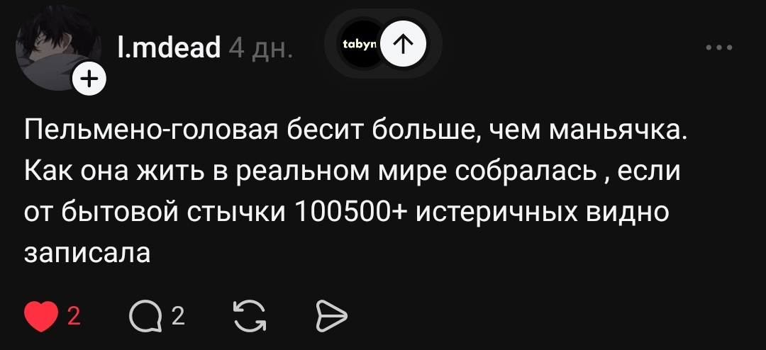 >>26170422 → Общественный резонанс и слезки аружанки зарешали 100% Так как до этого писали - что соседи Анели уже и полицию вызывали и заявления писали - так её не за что садить, ну поругалась она с кем-то недалеко от своего дома, ну позвонила в двери, попинала их, погуляла по подъездам и на этом.. ВСЁ. Поэтому на этом всё всегда и останавливалось. Да и все забили уже на неё. А аружанка манипуляторша слезками сама более мутная - возвращается в 3 ночи в пафосной шубе, с 17ый айфончиком и крутит попами в тик токе. И всё это в маленьком городе где обычные ЗП это 30-35к. Да, это к делу не относится, но как будто у нашей слонихи нюх на таких не эскортниц Раздула в соц. сетях из мухи слона. Как на это все повелись - я вообще не понимаю, у многих баб всегда так на словах - чуть ли не убивают её, а по факту обычный словесный конфликт, где пальцем никто никого не тронул. =МАМААА МЕНЯ ФУРАА УБИЛААА!= По её логике так можно много кого в дурку отправить, вот только даже в школах процветает буллинг с реальными побоями, а всем все равно, про взрослую жизнь вообще молчу.