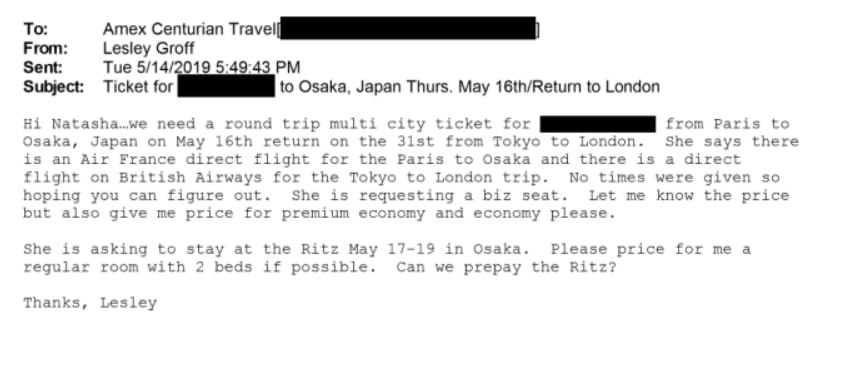 Некий или Некая Лесли 14 мая забронировал билеты в Осаку и номер в Ritz на 17–19 мая, и ровно в эти даты НЕКАЯ уже вовсю шикует в Осаке, подтверждая в чате, что они заселились именно в этот отель.