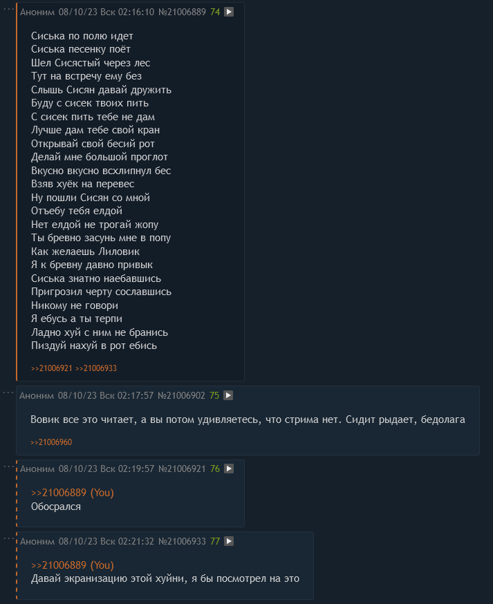Пиздец насрал в шапку каким-то хомяком которого никто не видел никто никогда не смотрел и не знает, из ретротусы его никто не знает, далее, яна, 20 лет назад жирдяй с хутора дарил ей подарки, всё, потом идёт сам жидяй о котором кинаман даже не хочет слышать, это было давно и не правда, в таком ключе и последнее группа плазма сука плазма блять, ты точно здоров? Мне кажется ты либо бухой, либо под веществами. Хотя может быть что упорот всем. Это самый настоящий нерелейтед кал и угон треда.