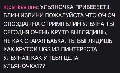 >>26192179 У неё "устойчивых" осталось штук 5 в чате с прошлого года. Остальные пришли после презентации Полякова. С тем же успехом она может молча сообщать новым зрителям, что парень есть, без этого фансервиса для пары куколдов