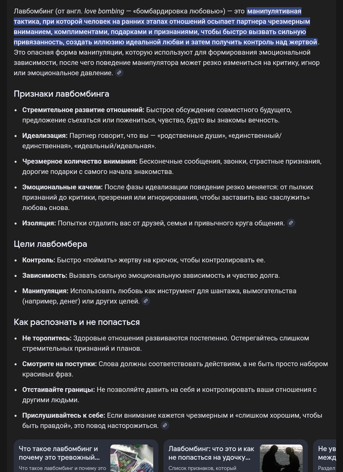 >>26191603 >опасная форма манипуляции Ебать они охуели, то есть им неведомо чувство, когда тебя любовь окрыляет, фемки и прочие протерапевтированные везде ищут подвох и как раз они и устраивают манипуляции, используя эти термины, бездушные мрази то есть если это они этим занимаются,то это "влюбилась по уши, души не чаяла", а если неугодный - то лавбомбинг(опасная форма манипуляции!). смотрите не перепутайте.