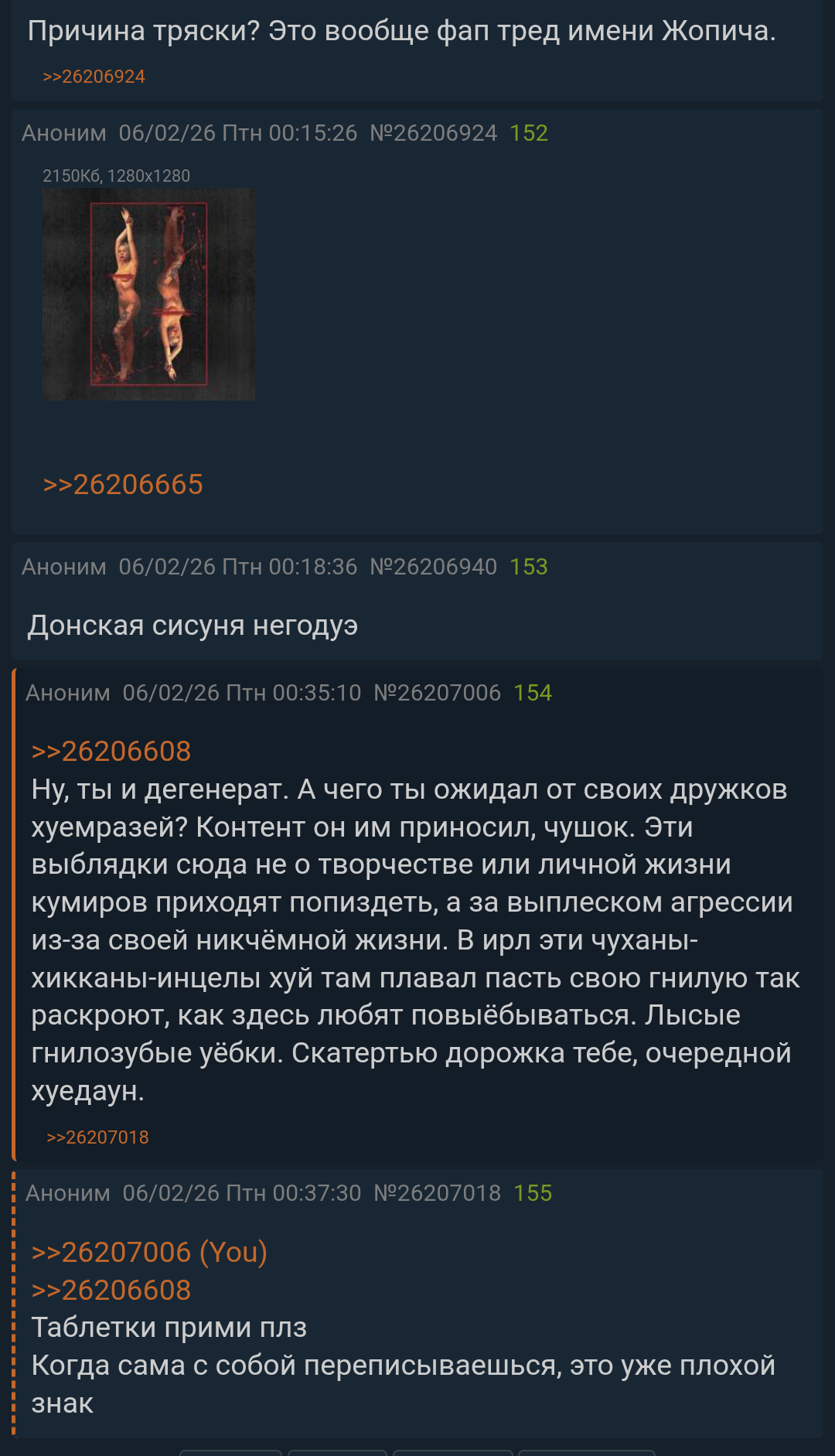 Пидорасы, вот вам и приноси контент, так вы тут каждого за фемку или мурену принимайте. Сами нытье развели что тред сдох, а потом как шавки кидайтесь. Да мне похуй на залетных сисунь и агрошизов, которые на мои посты отвечают, но ваши доебки до меня "сисуня выгораживает шлюх бла бла бла", ну пиздец ваще. Вы совсем ошизели в край! Лично мне вот похуй на фемок, блядей, твиттерских соевиков и т. п., для меня все это сплошной кал, над которым только ржать остается. Короче, ну вас нахуй. Обсуждайте тут ебанизм хуйши, клепайте порно нейрокал с жопичем, залипайте на стримы дипикса и дальше гасите любое упоминание/обсуждение жопичей. В общем, покрывайтесь плесенью и сосите каловые массы друг друга.