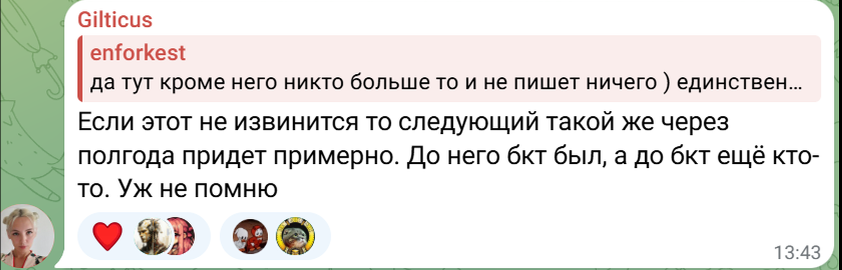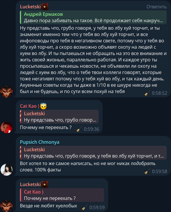 >>26184125 >>26184130 >>26184134 Из анализа представленных письменным источников следует, что у пациента Лакецкого имела место лютая биполярчка. Периоды любви и восхищения к Жене сменялись приступами ревности и самобичевания, а троллинг и подъебы - смиренными извинениями и крупными донатами. Как нам известно, в результате пациент не выдержал и сбежал, обвинив во всем стримериху. Но побег оказался фейковым, ведь всем известно, что ЖЕНЕЧКА НЕ ОТПУСКАЕТ, и Лакецкий продолжил наблюдать за любимкой, теперь тайком. Закончилось все крайне печально, - рассылкой той самой фотки с отсосом симпам в личку, что немедленно получило огласку и предало Лакецкому несмываемому позору, увы С тех самых пор его никто не видел...