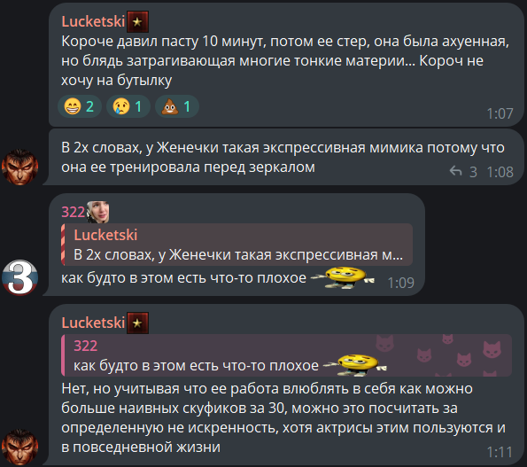 Это для подумать симпам, что никто из старых знакомых не считает Женю настоящей женщиной. Такие дела.