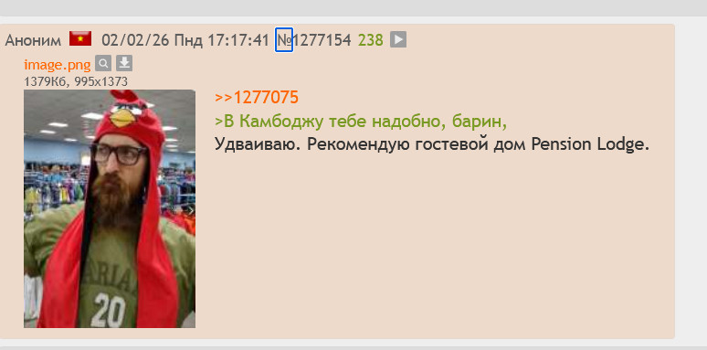 БОРОДАО (ПУТЬ БОРОДЫ): 2016 21.06 Уренгой-кун получил от мамы 700000р. 26.06 Борода улетел из Уренгоя в Москву, 27.06 прибыл в КАМБОДЖУ. На дорогу ушло 43к. 9.07 купил ноут. В Камбодже Борода пытался работать, потом уехал в Нячанг на неделю и знатно обосрался. 6.09 Витя вернулся в Камбоджу, 22.09 на два дня стал ПОЛНЫМ ПАТЧЕМ банды байкеров BLACK COBRA и сбежал, дав $250 отступных 22.10 Витя купил билет в Петербург, через день отменил перелет, став хэндименом в гостинице. Борода распрямлял гнутые столы, с помощью анонов чинил сушилку, чистил бассейн Встретив главаря банды Гену, 1.11 Витя уехал и неделю хикковал в Бангкоке. В ноябре Борода вернулся в Нячанг, жил в комнате с окном в коридор 1.12 Борода купил невозвратный билет в СПб за $428 и не полетел. 10.12 Витя скрылся в Пномпене, пропав с борд на месяц