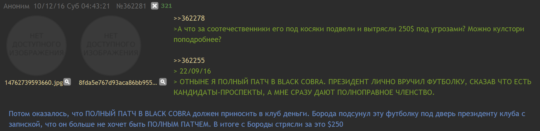 >>26218125 После вступления в банду, он пошел по поручению Пахана за паеетом гречки куда - то, с кем встретился попить чай и забил хуй на свою банду, после чего Гена (татуированный на фотке) надевал ему лещей, отчего Борода чуть не заплакал, что поставило Гену в не плохой такой ахуй (Борода очень внушительно выглядел, он был ещё откормленный тогда) . Про долг не помню. Посню только, что Борода неплохо так обосрался.