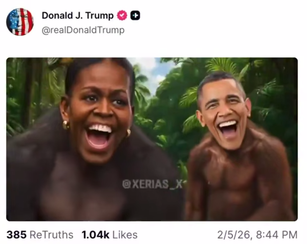 >>26209685 а донни сам ведет свой Твиттер? типа, если да... вы хотите сказать, что 79 летний топовых бизнесмен Америки, президент США по второму сроку, один из самых, если не самый, влиятельный чел на Земле, посылает картину в Твиттор с фотошопом Абэмки-обезьянки?!