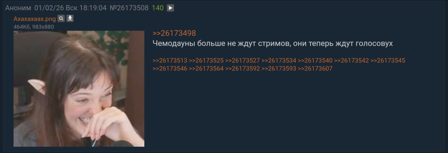 >>26221693 Никто не смотрит, эта хуета сидит с 20 зрителями ну и 1 уебан у нас спамит и форсит это уродливое рыжее дерьмо. Но мы его каждый тред обоссываем, так что баланс соблюдён.
