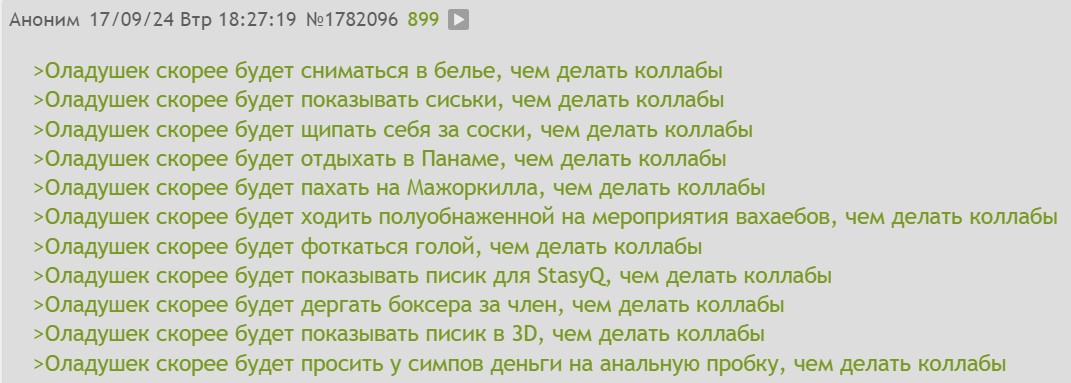 Буквально за полгода, прошедших с начала 4-го треда, Оладушек развила мощную активность, закорешилась с известными когда-то фотографами вроде Мурбо и начала покорять западных подписюнов на Fansly, а также засветилась на StacyQ, StasyQVR и Photodromm.