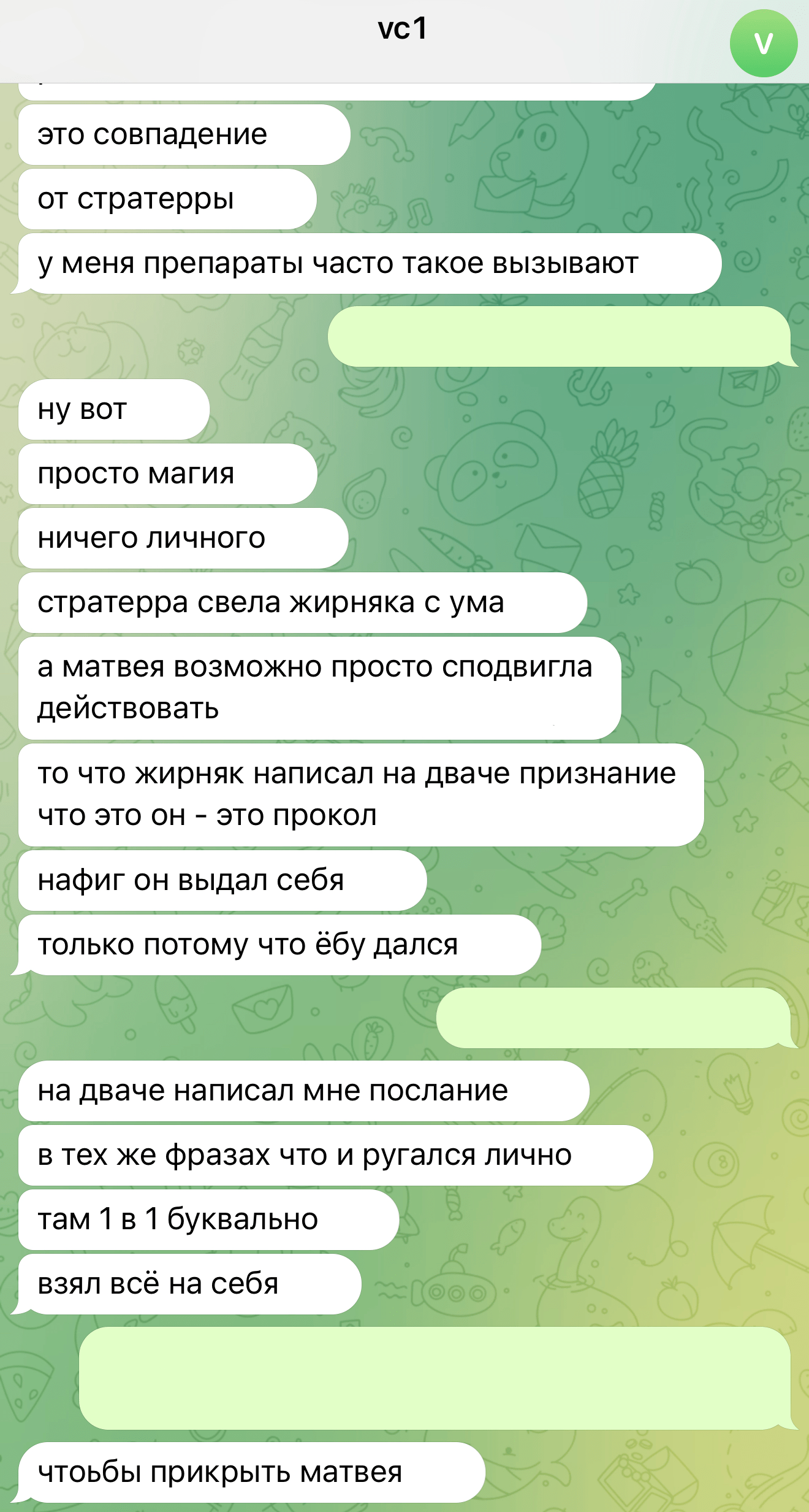 Виктор Мефедронов: Если ко мне придут менты то вы мои смертельные враги. Потому что в тюрьме я с высокой вероятностью умру, а вину разделят топовые хейтеры. Классно будет звучать - аспирант по физике Артём за то что его выгнали из чата посадил за старые переписки кандидата по физике Виктора, который умер в тюрьме. Посотрудничал с правоохранительными органами РФ против очередного неугодного музыканта