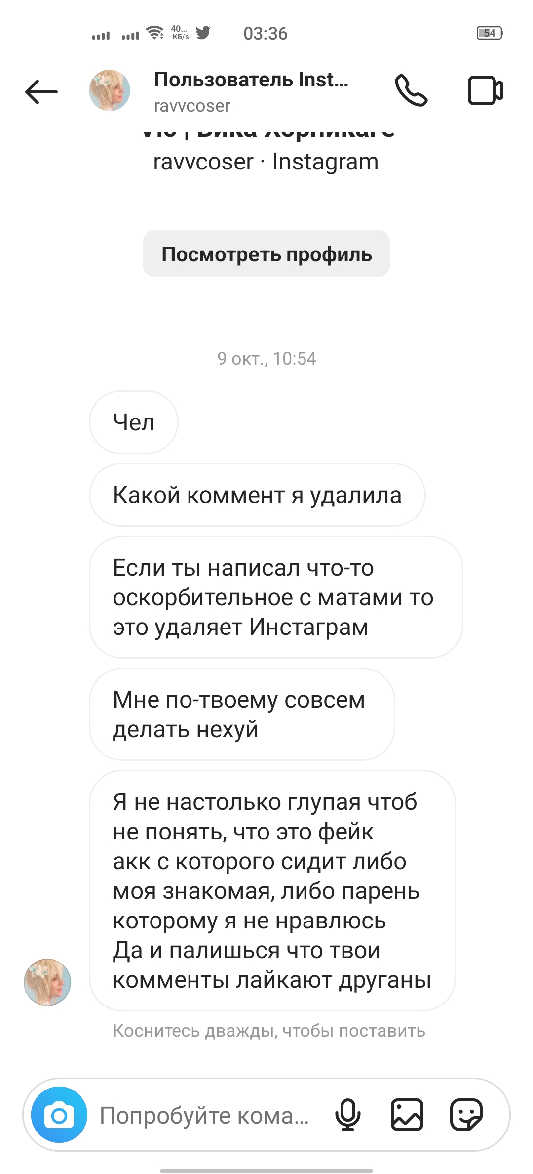 >>1713701 Сказал этой пидарше, образно, что косплей который она сама слепила убогий. Она писала,чтобы я поплакал. Дальше чё то ещё было, что она даже в ЛС написала мне, вот ниже кинул. В ответ написал, что её контент может не всем нравится и это нормально, за что получил бан))
