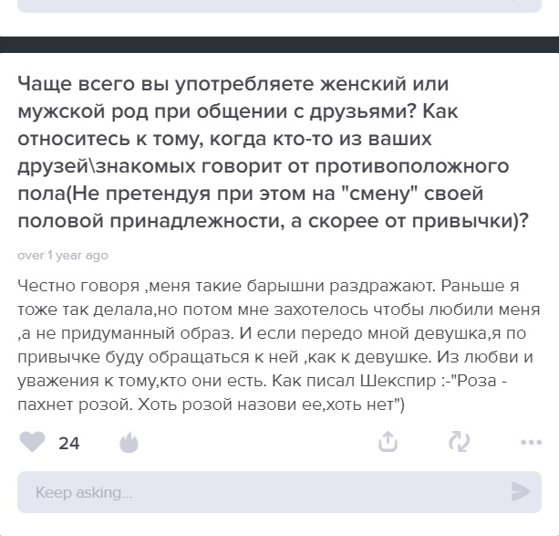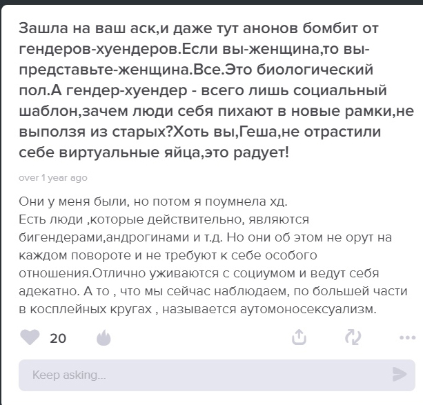 Геша (ирл имя Карина, кстати) в 2009-2013 годы, пока к ней особо слава не нагрянула, активно хуесосила яойных принцев, трансух и остальных, кто называет себя в мужском роде. Она просила называть ее в женском роде, некоторым френдс даже по реальному имени, говорила что она лесба (именно лесба, не гетерокун), что она баба и любит баб. Щас хз что там перемкнуло. Мы с Гешей одно время хорошо обшались, но итог немного предсказуем. Обратите внимание, что у Геши друзья вообще надолго не задерживаются. Кроме тех, кого она использует (ради фоточек в основном, как Мокрушину). Потому что характер у нее истеричный, ебнутый и явсегдаправа.