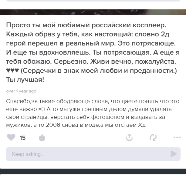 К Геше относился нормально, даже интересовался ее работами, когда она пилила изолоновые крылья где-то 5 лет назад. Просто всякое уважение к ней упало, когда она приехала на мой местный фест судьёй. Я ещё более ЧСВ-шную трансуху не видел, это пипец какой-то. Все косплей-судьи были нормальные: улыбчивые, дружелюбные, веселые, но она прям выделялась говнистостью. Когда проходило судейство, она либо залипала в телефон, либо выебывалась. То есть все хоть как-то проявляли интерес к участникам, спрашивали что да как шилось и крафтилось. Геша иногда выборочно отрывала еблет от телефона. Одну тянку на фесте в лицо засрала, так как у нее был одинаковый косплей с Гешей (и кстати, ничем не хуже). Другой сказала, что вообще не будет оценивать костюм "так как этого баянного перса видит на каждом фесте". Это песец просто. Все это правда было несколько лет назад, может у Геши сейчас мозгов поприбавилось.