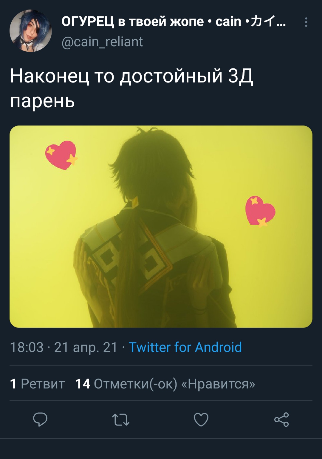 кому сейчас вообще нужны эти яойные принцы с нарисованными мужскими торсами? я могу понять это дело лет 6 назад, мужиков в косплее мало, и мокрощелки готовы себя обманывать что вот это действительно мужик, да, сейчас тех же Иноске в мужском исполнении хватает да и в целом мужиков больше и ладно там Овсян, его мало кто женщиной помнят, но Геша то известна весьма и врядли ее как мужика кто то всерьез у нас воспринимать будет