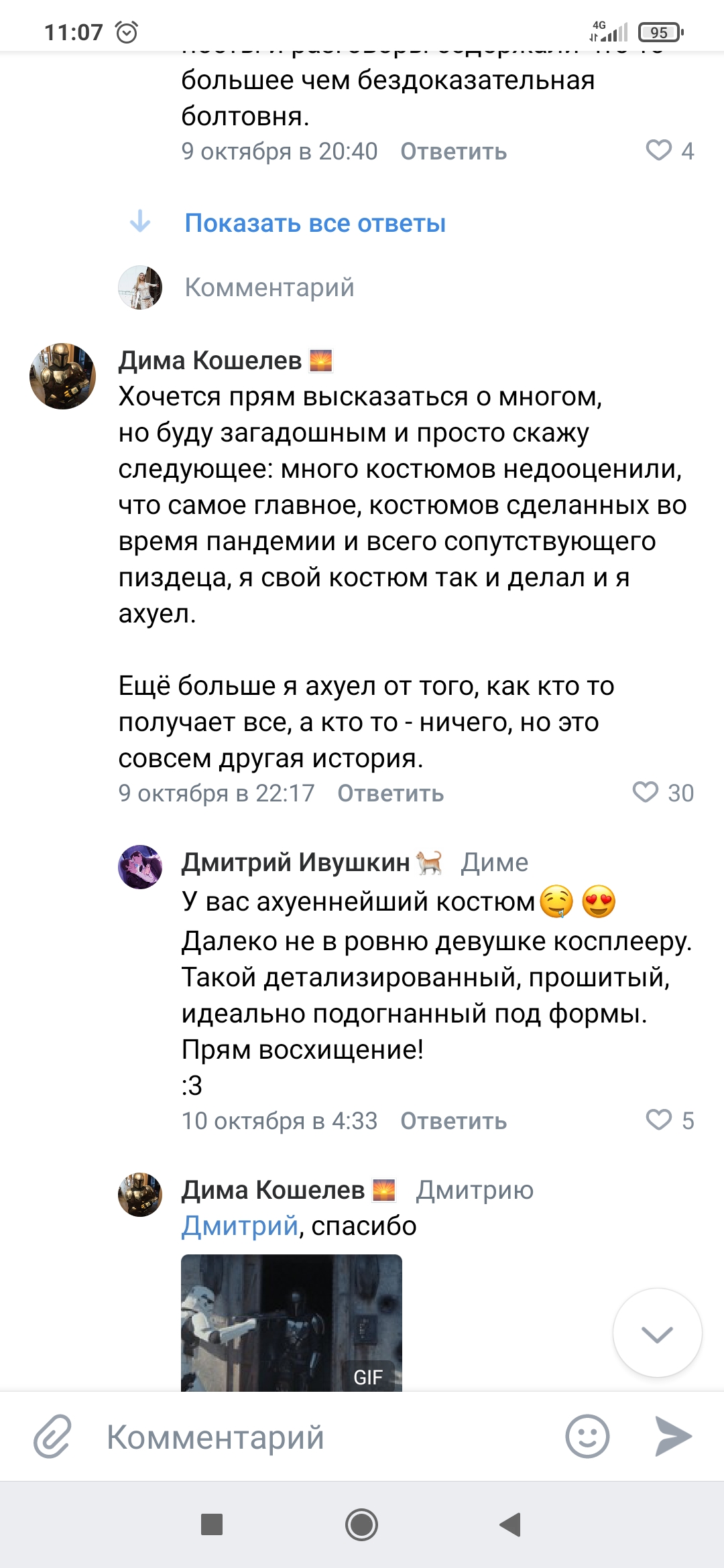 Как же я счастлива, что она в свое время слилась с костюма, который я хотела у неё заказать. В костюме важной частью была вышивка, и первый, кто пришел в мой неокрепший на тот момент мозг - грандмастер вышивки (хз почему я вообще так решила) Кристина Ривийская. Я написала ей в директ с фотками того че хочу, был вариант сделать аппликацию, а вышивка типа будет стоить очень дорого, она сказала 50к. Денежный аспект меня вообще мало волнует, я сказала, что согласна, только бери и шей (не прямым текстом) и... Она больше так ничего и не ответила, что мне показалось, во-первых, странным, а во-вторых, она как ни крути потратила моих несколько дней, так как костюм надо было к игромиру сделать. Короче в итоге я нашла богиню пошива и вышивки и она мне сделала всё за 16к, это был тот случай, когда я была бы даже рада заплатить больше. Мораль истории - ценовая политика ПИЗДЕЦ у неё, видимо для такие как я - кто костюмы делает раз в десять тысяч лет и на деньги плевать. Сейчас только господь знает какую бы хуйню она мне там вышила и сшила. Поскольку этот тред она наверняка читает, то и сдеанонит меня моментально, но я считаю у меня есть моральное право предупредить про заведомо неадекватные цены, ну и плюс, если вам вдруг срочно нужен костюм, то она вполне может отнять у вас пару дней на переговоры, а потом уйти в закат