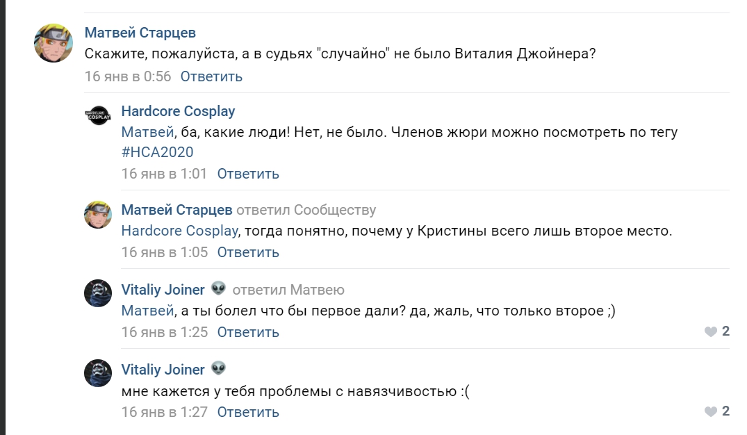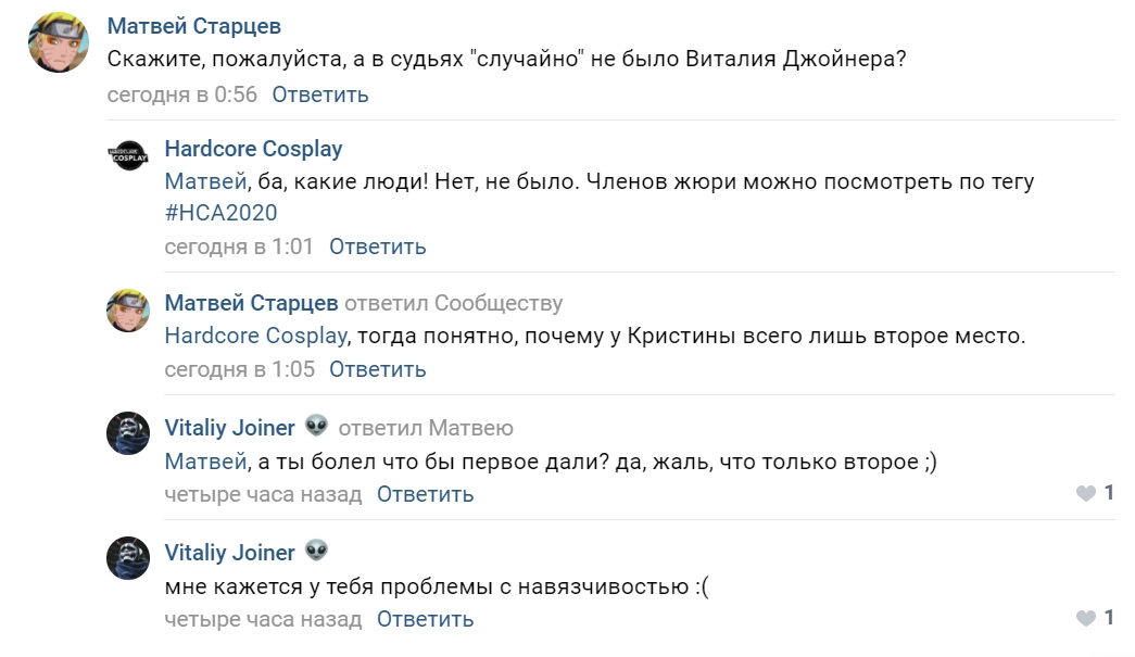 Уже неоднократно высказывали мнение, что Ривийской и ее хахалю НАСТОЛЬКО похуй на хейтеров, что они рвутся на тряпки под каждым мало-мальски к ним относящимся высером в вк, в тви, на дваче, да где угодно. Мимо не пройдут, ни одного холивара за косплей не пропустят, везде надо вписаться со своим охуЭнно важным мнением. Причем, чем правдивее критика - тем яростнее вопли "мне вообще пох и внимания не обращаю на вас, но все равно прибежала сюда на 5й космической порвать свой пердак за правду!"